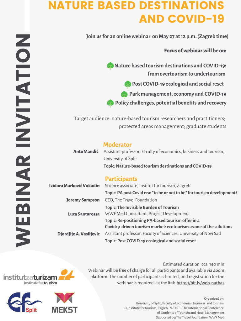 May 24, 2020May 30, 2020 Nature-based destinations and COVID19 – webinar invitation Video of the webinar 27th May 2020 12:00 Share this: Click to share on X (Opens in new window) X Click to share on Facebook (Opens in new window) Facebook Like Loading... Related