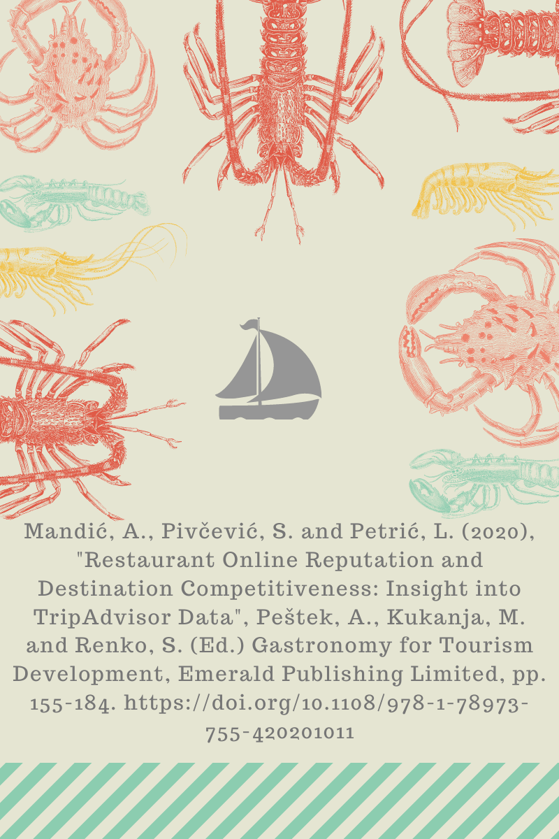 Mandić, A., Pivčević, S. and Petrić, L. (2020), “Restaurant Online Reputation and Destination Competitiveness: Insight into TripAdvisor Data”, Peštek, A., Kukanja, M. and Renko, S. (Ed.) Gastronomy for Tourism Development, Emerald Publishing Limited, pp. 155-184. https://doi.org/10.1108/978-1-78973-755-420201011
